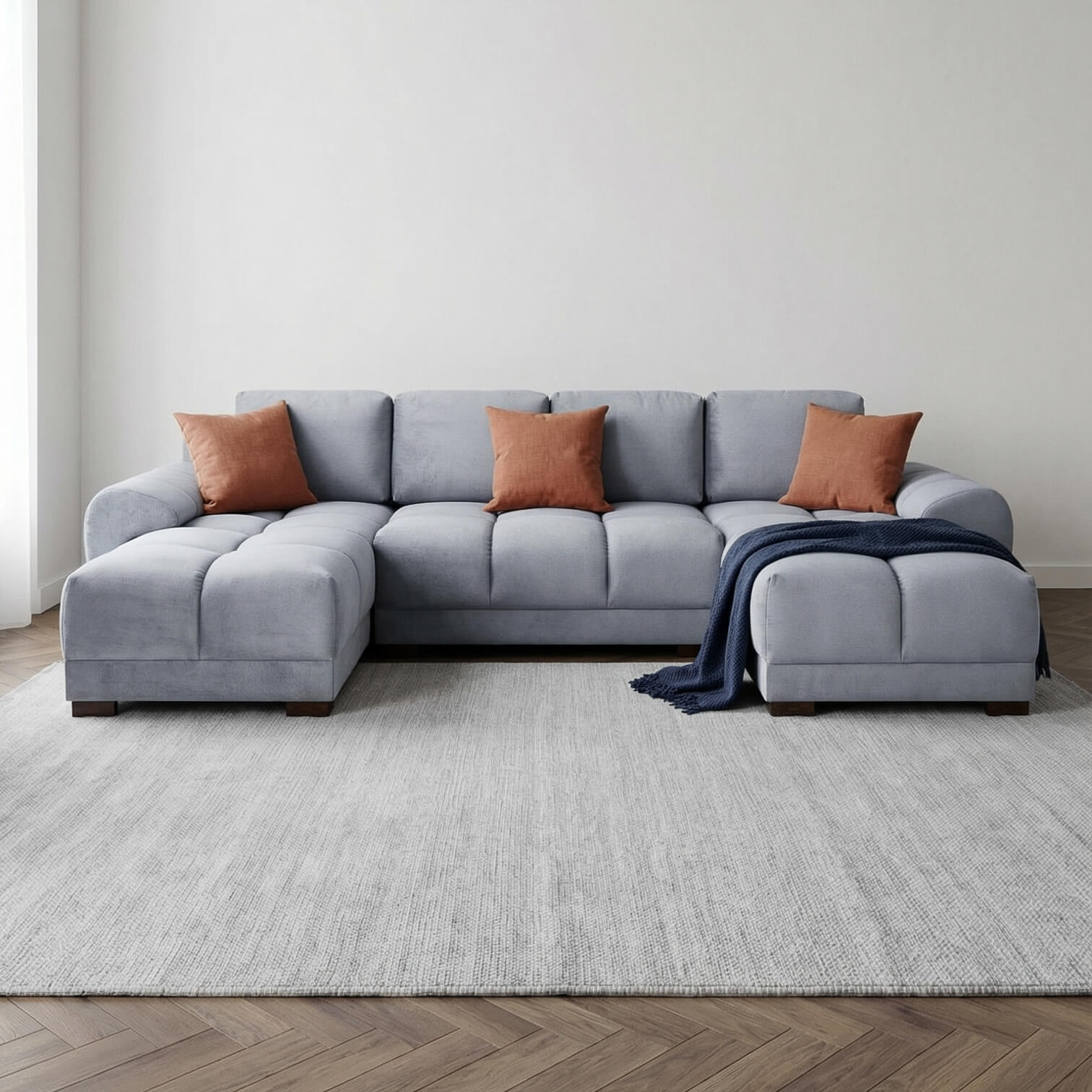 Elevate your living space with the Avoro U Shape Sofa in Silver Grey. Plush velvet upholstery, attached seat cushions, removable back cushions, and anti-slip feet deliver lasting comfort and flexible seating. Spacious and stylish, this U shape sofa is perfect for family lounging, entertaining, and everyday living.