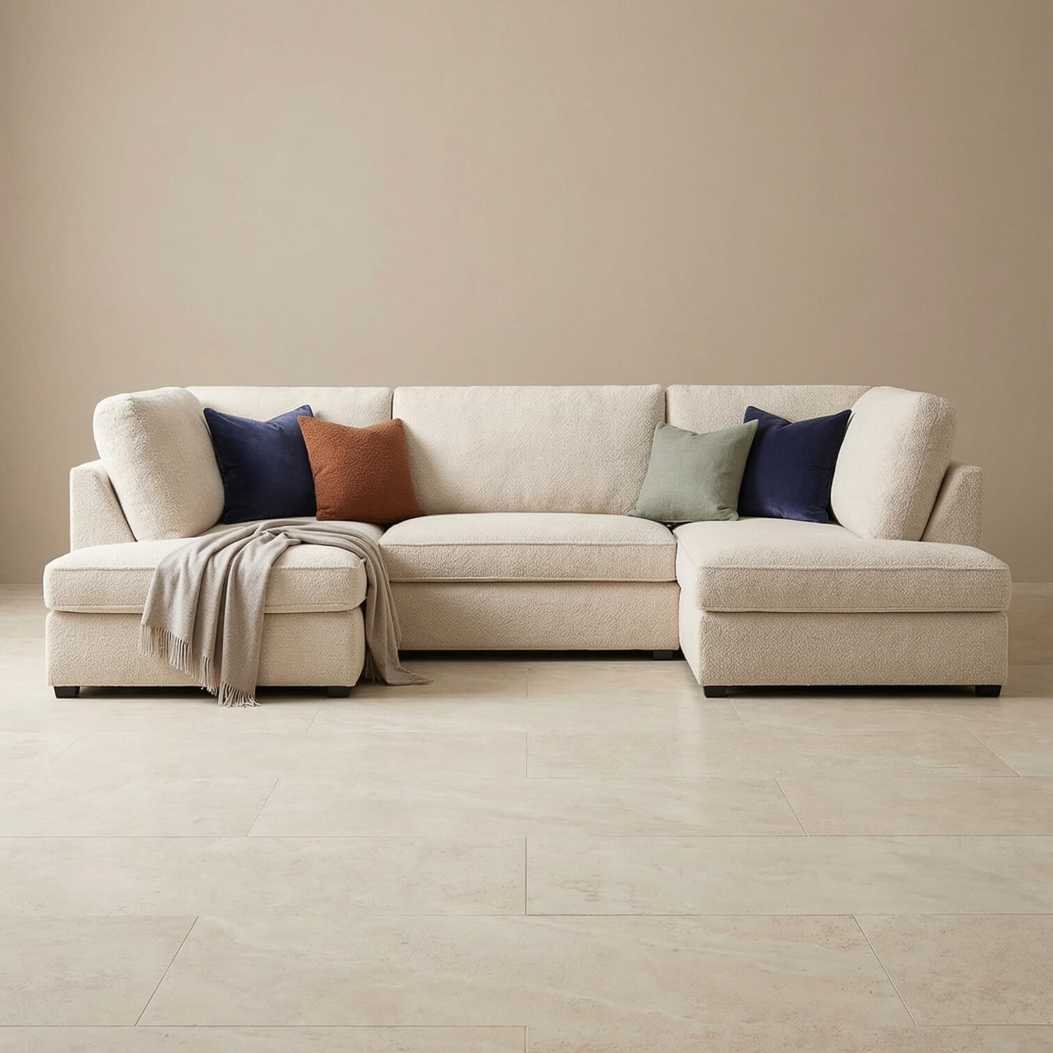 Relax in style with the Carmelle U Shape Sofa in Buttermilk Beige. This beige u shape sofa features soft boucle fabric, a spacious U layout, removable seat and back cushions, and a solid hardwood frame. Comfortable, practical, and stylish, this fabric u shape sofa is perfect for family time, entertaining, or unwinding in your lounge.