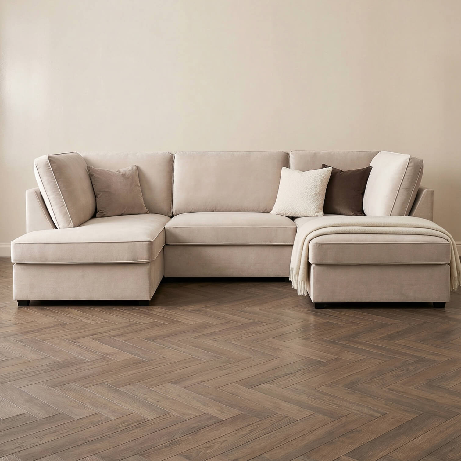 Upgrade your lounge with the Carmelle U Shape Sofa in Soft Beige. This beige u shape sofa features luxurious velvet fabric, a spacious U shape layout, removable seat and back cushions, and a solid hardwood frame. Comfortable, stylish, and practical, this fabric u shape sofa is perfect for family time, movie nights, or relaxing with friends.