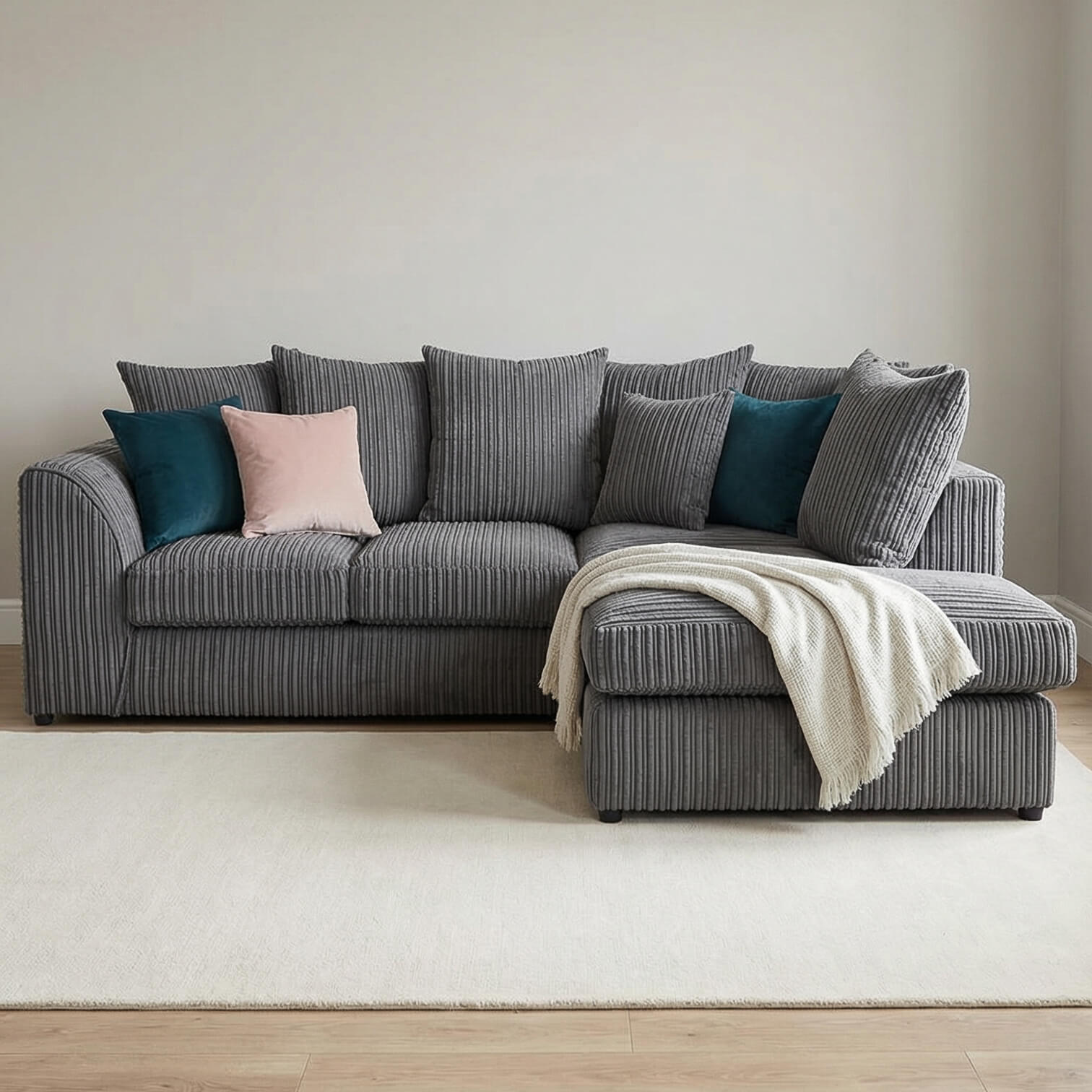 Make the most of your lounge with the Chicago L Shape Corner Sofa in Charcoal Grey. Jumbo cord upholstery, foam filled removable cushions, and a scatter back design create soft, supportive seating. This corner sofa in left or right-facing options combines style and comfort for modern living spaces.