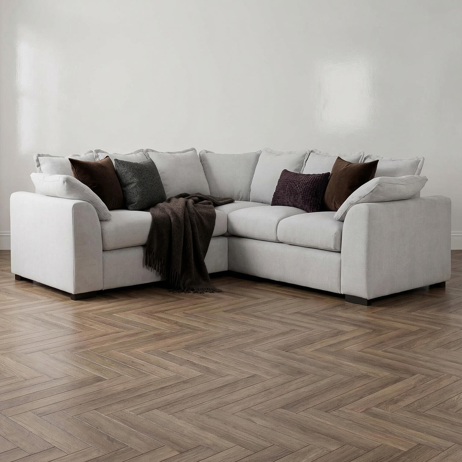 Create a cosy lounge with the Colbain Corner Sofa in Alpine Mist Grey. This fabric corner sofa combines soft polyester upholstery, supportive back cushions, and removable covers for easy cleaning. Its spacious five seater layout makes this grey corner sofa perfect for relaxing, family time, or entertaining friends in style.