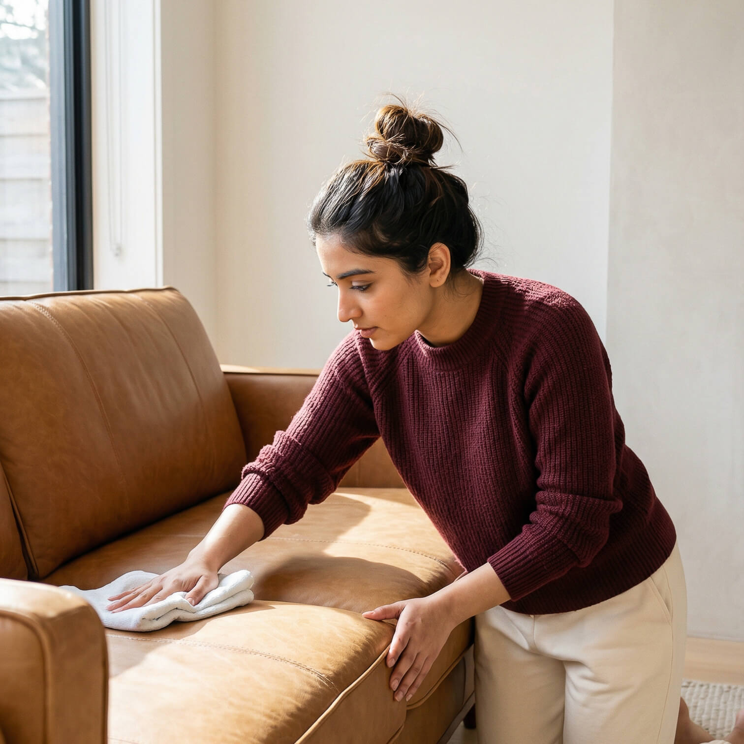 Act quickly. Gently blot spills with a clean, absorbent cloth. Avoid rubbing, as this can spread the stain. Use the products provided in your care kit as directed for safe and effective treatment.