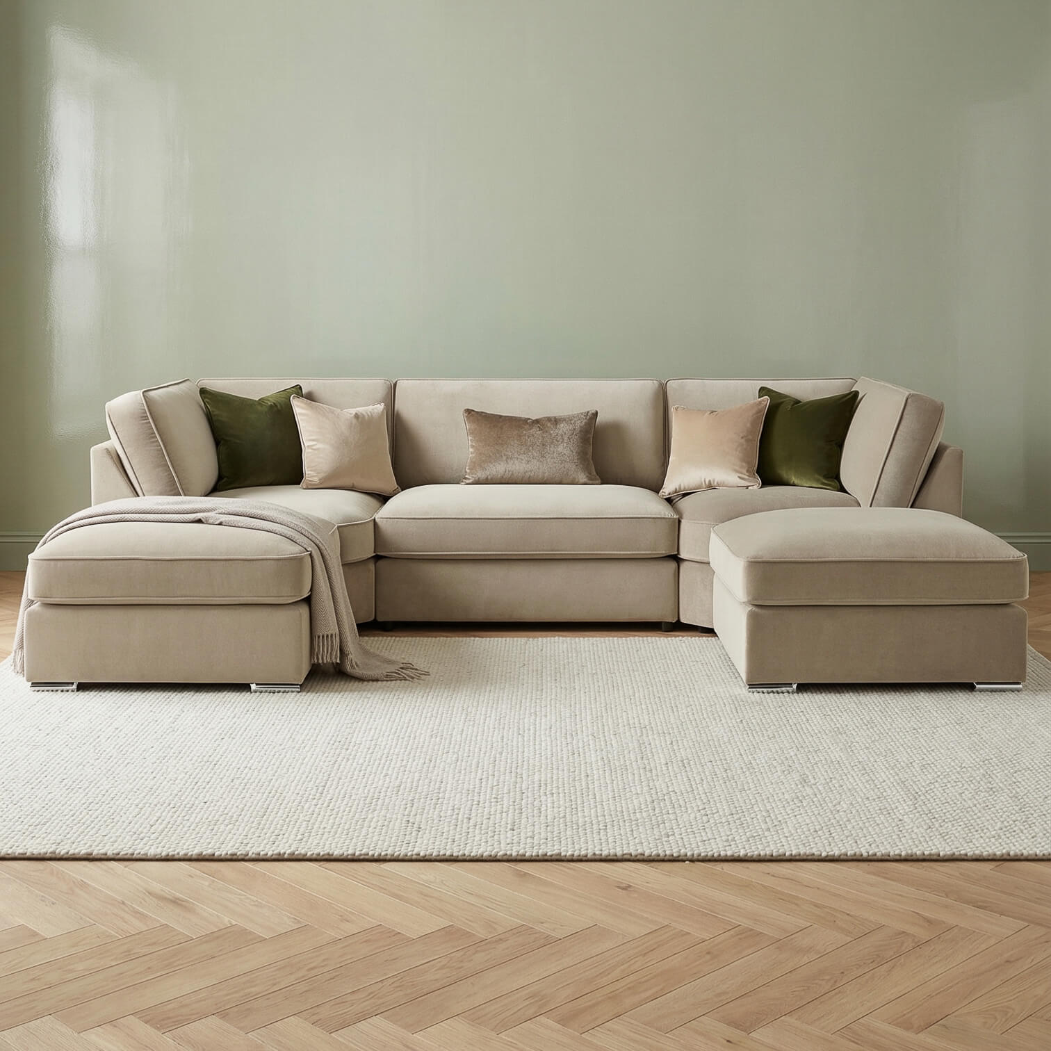 Meet the Marvelle U Shape Corner Sofa in Sandstorm Beige. This beige u shape sofa features soft velvet, a spacious U layout, movable footstool, full back support, attached seat cushions, and removable back cushions with washable covers. Built on a solid hardwood frame, it’s stylish, practical, and perfect for family time or relaxing in style.