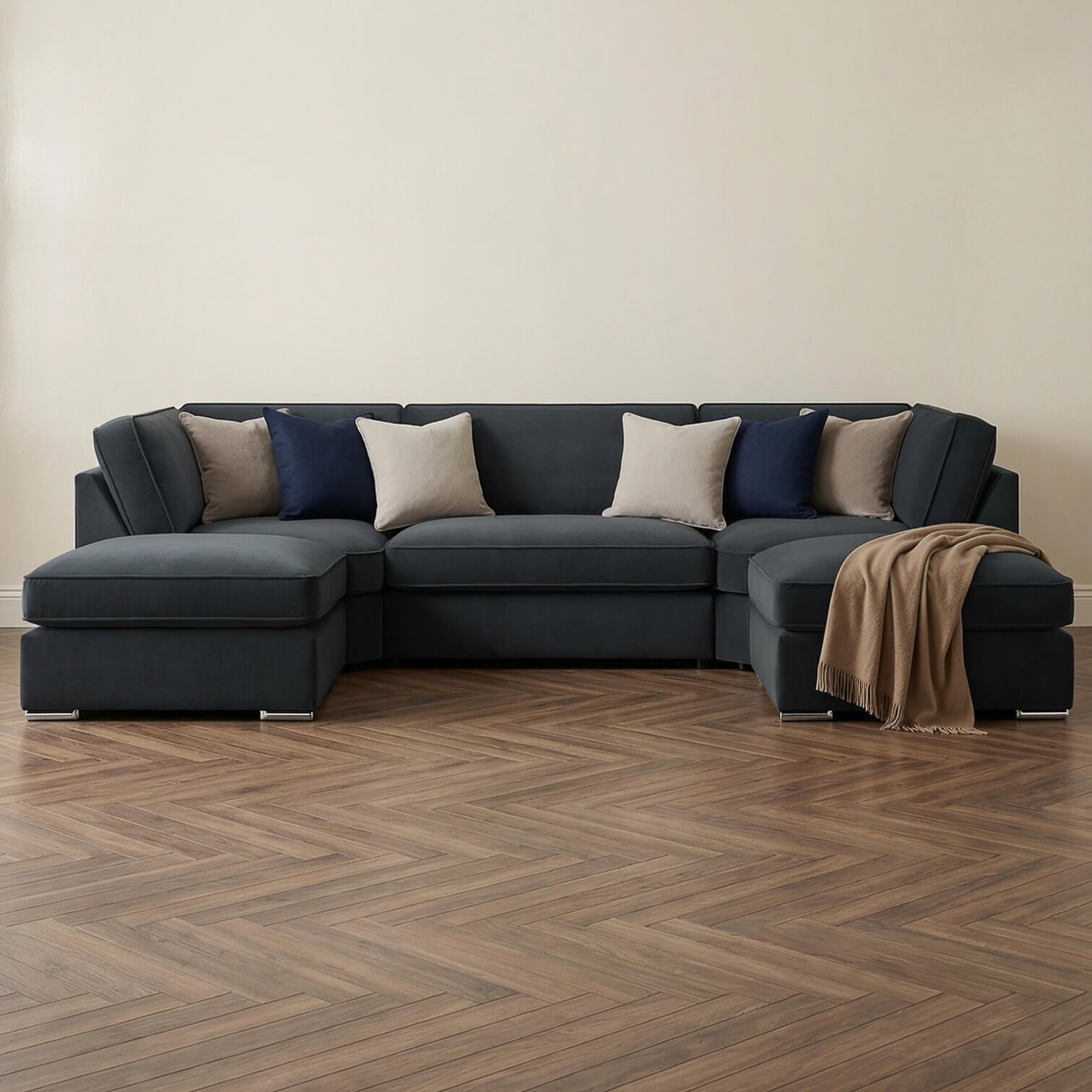 Meet the Marvelle U Shape Corner Sofa in Onyx Black. This black u shape sofa features soft velvet, a spacious U layout, movable footstool, full back support, and removable back cushions with washable covers. Built on a solid hardwood frame, it’s stylish, practical, and perfect for family time, entertaining, or relaxing in style.