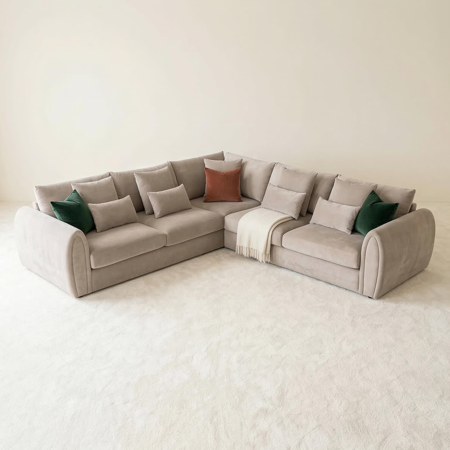 The Mira Double Corner Sofa in Biscotti Brown offers maximum seating for family and guests. Upholstered in plush velvet with removable cushions, this sofa combines elegance, comfort, and functionality. Perfect for entertaining or relaxing, it brings versatile style to larger living spaces.