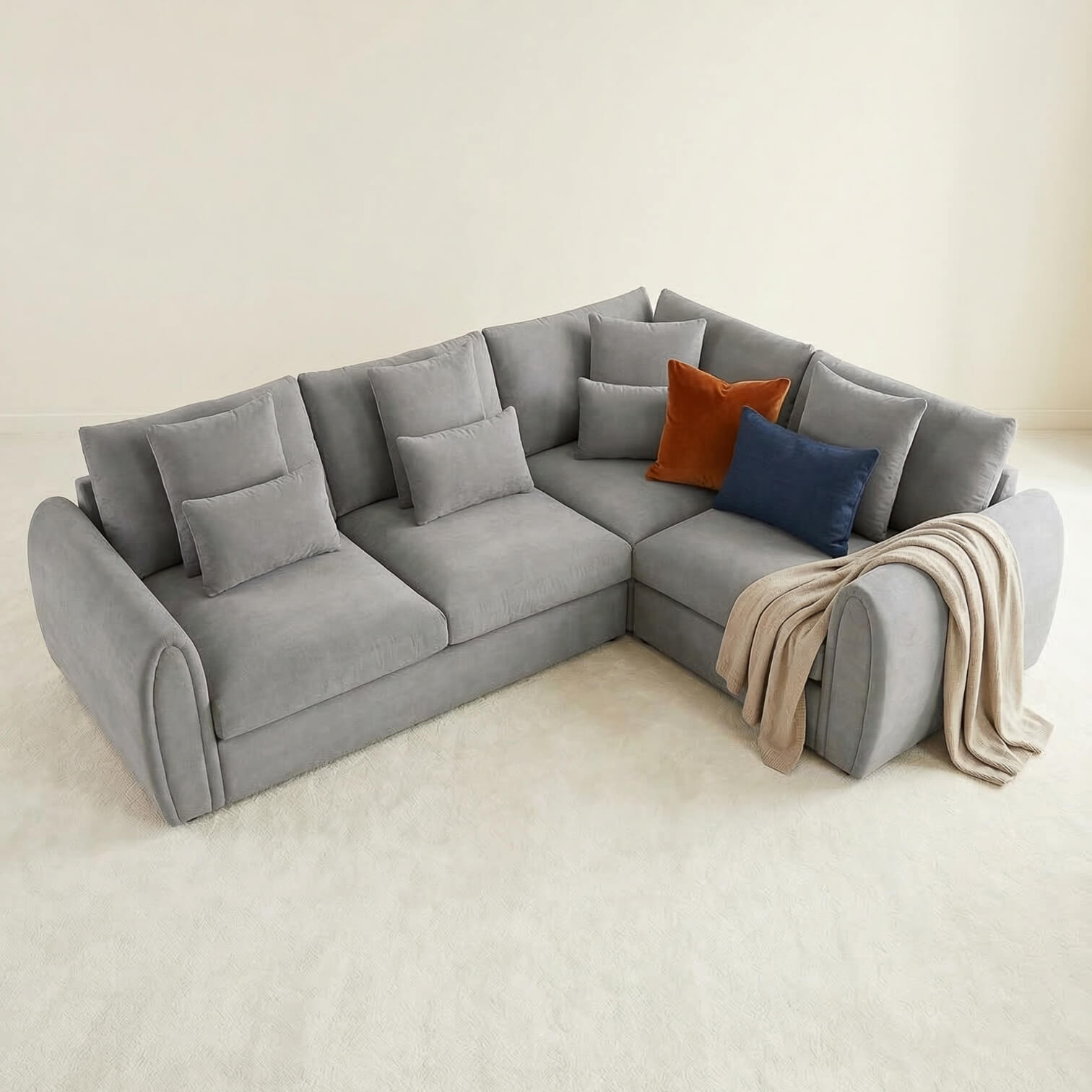 Make space for comfort with the Mira Right Corner Sofa in Sterling Grey. Soft velvet upholstery, removable cushions, and extra comfort cushions deliver cosy vibes. Its full back design and spacious seating make lounging a treat, while easy to clean covers keep it looking sleek and fresh.