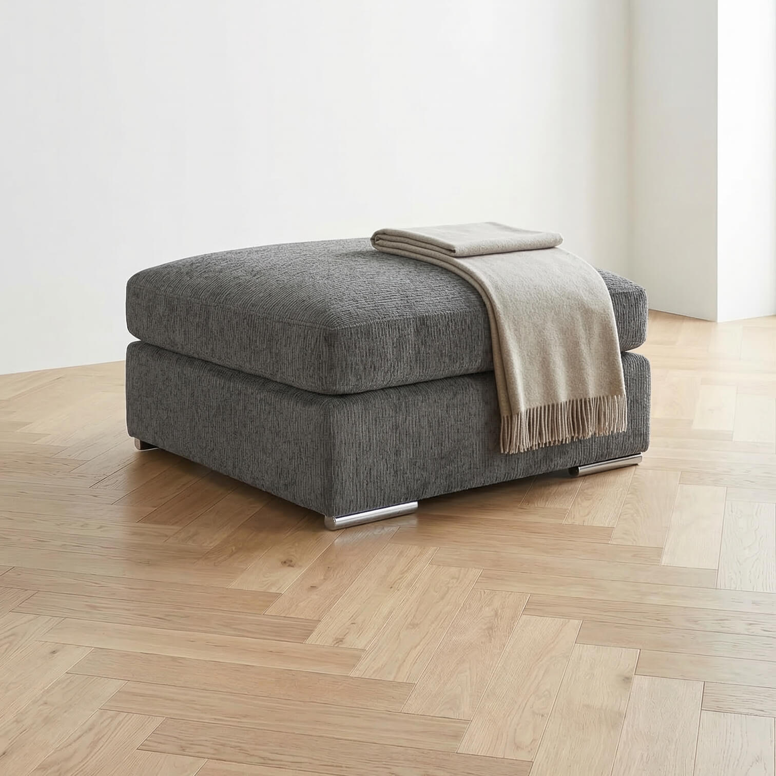 Complete your lounge setup with the Narela Footstool in Gunmetal Grey. Soft chenille fabric, foam filled top, and sturdy frame make it perfect for resting your feet or adding extra seating. Its sleek design pairs seamlessly with the Narela sofas and armchair, giving your space a polished, modern touch.