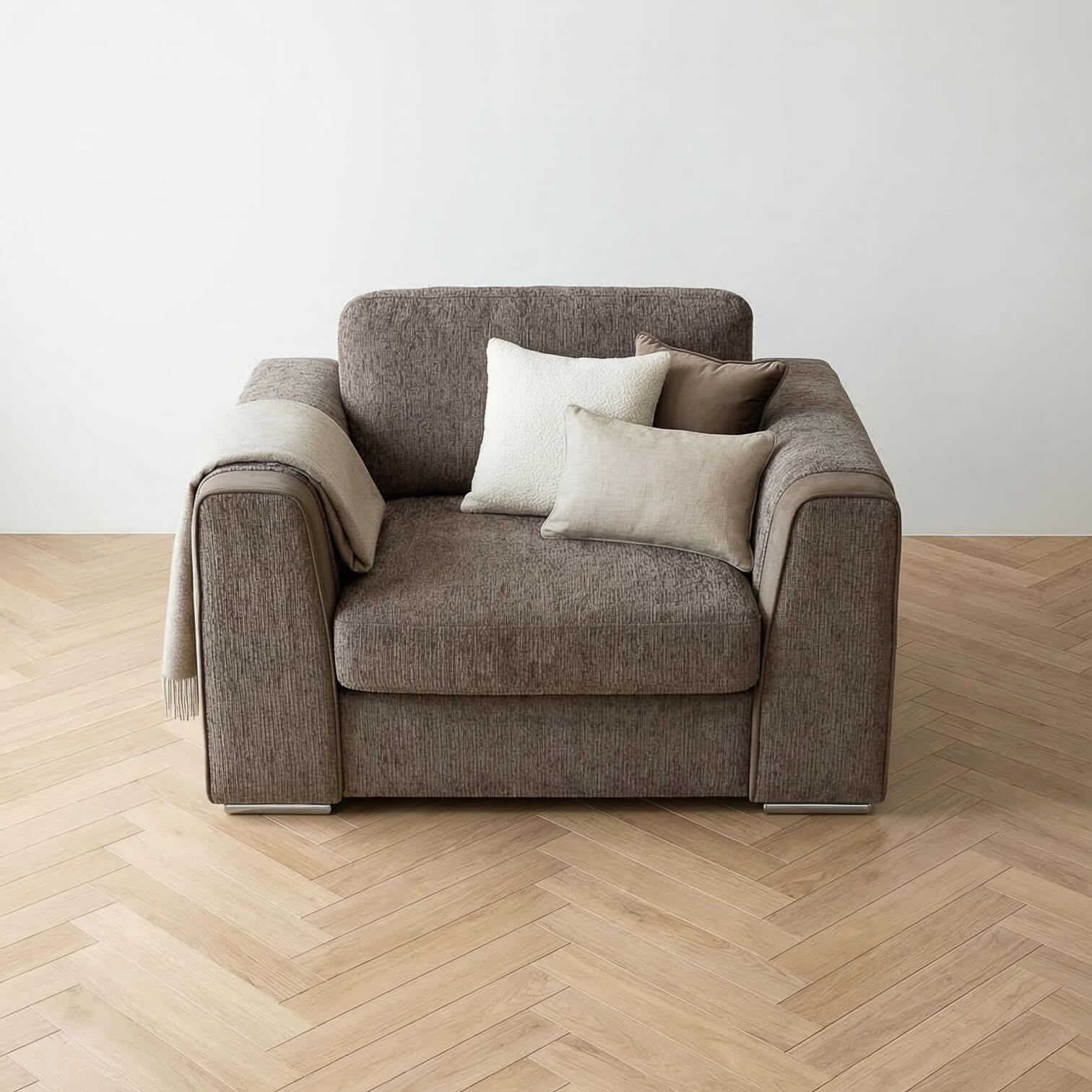 The Narela Armchair in Novo Mocha combines compact design with inviting comfort. Upholstered in plush chenille, it features removable cushions, a solid hardwood frame, and chrome legs. Its warm mocha finish adds depth and elegance, making it a versatile accent chair for any modern or traditional living space.