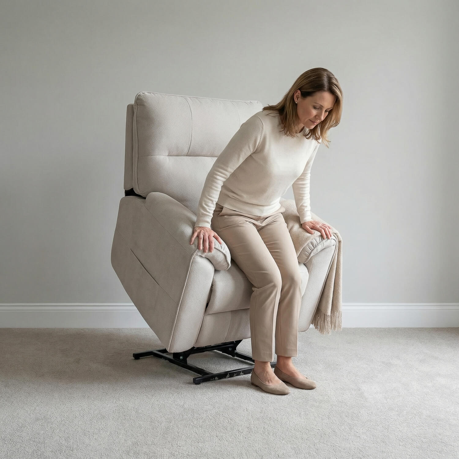Settle into supportive comfort with the Novar Heat & Massage Dual Motor Riser Recliner Armchair in Bone Beige. Designed for everyday ease, it features dual motor control for independent backrest and legrest positioning. Airbag massage gently works the neck, back, and lumbar, while integrated heat supports circulation and relaxation. Upholstered in durable fabric with a full metal frame, it delivers smooth lift assistance with comfort you can rely on.