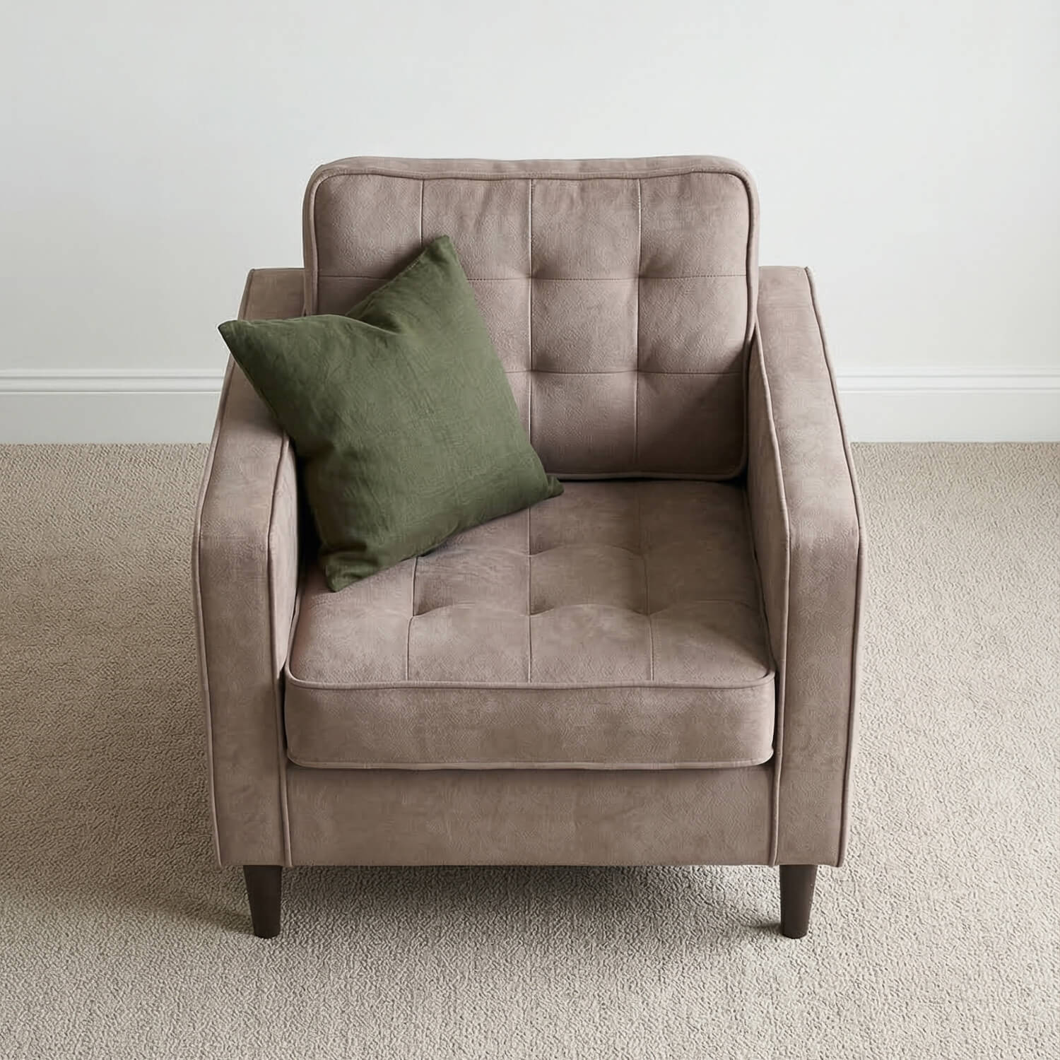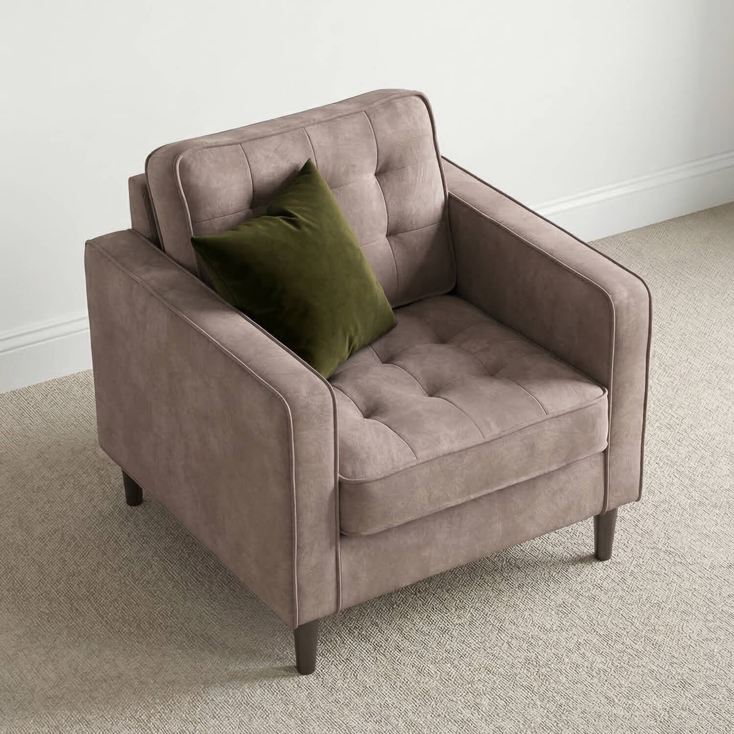 The Pico Pewter Grey Armchair offers compact comfort with a refined modern aesthetic. Upholstered in a soft yet durable microfiber blend, it features pocket sprung seating for dependable support and fibre filled backing for a relaxed sit. Its tufted back, slim track arms and tapered black legs make it an effortless addition to smaller living areas, bedrooms, or reading corners.