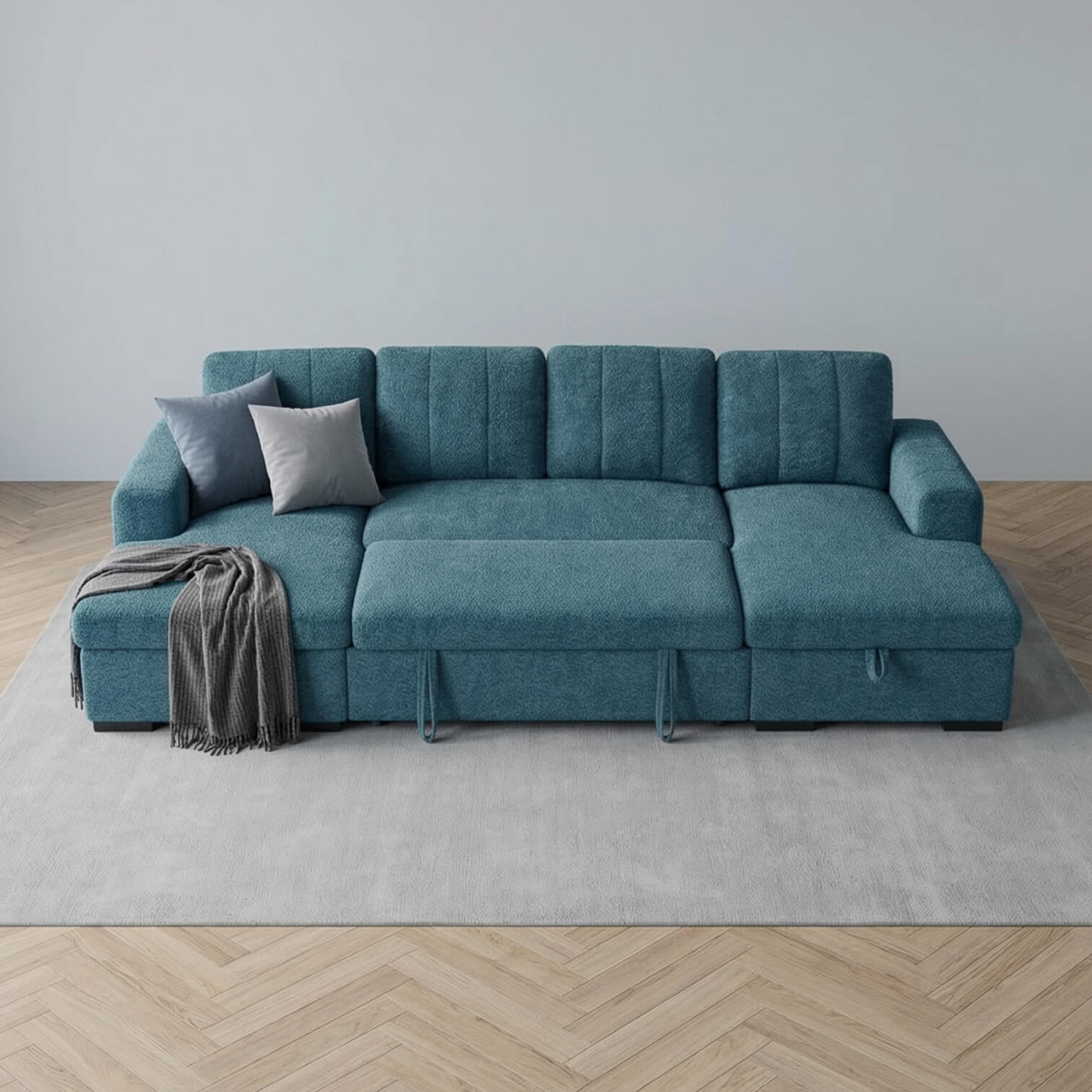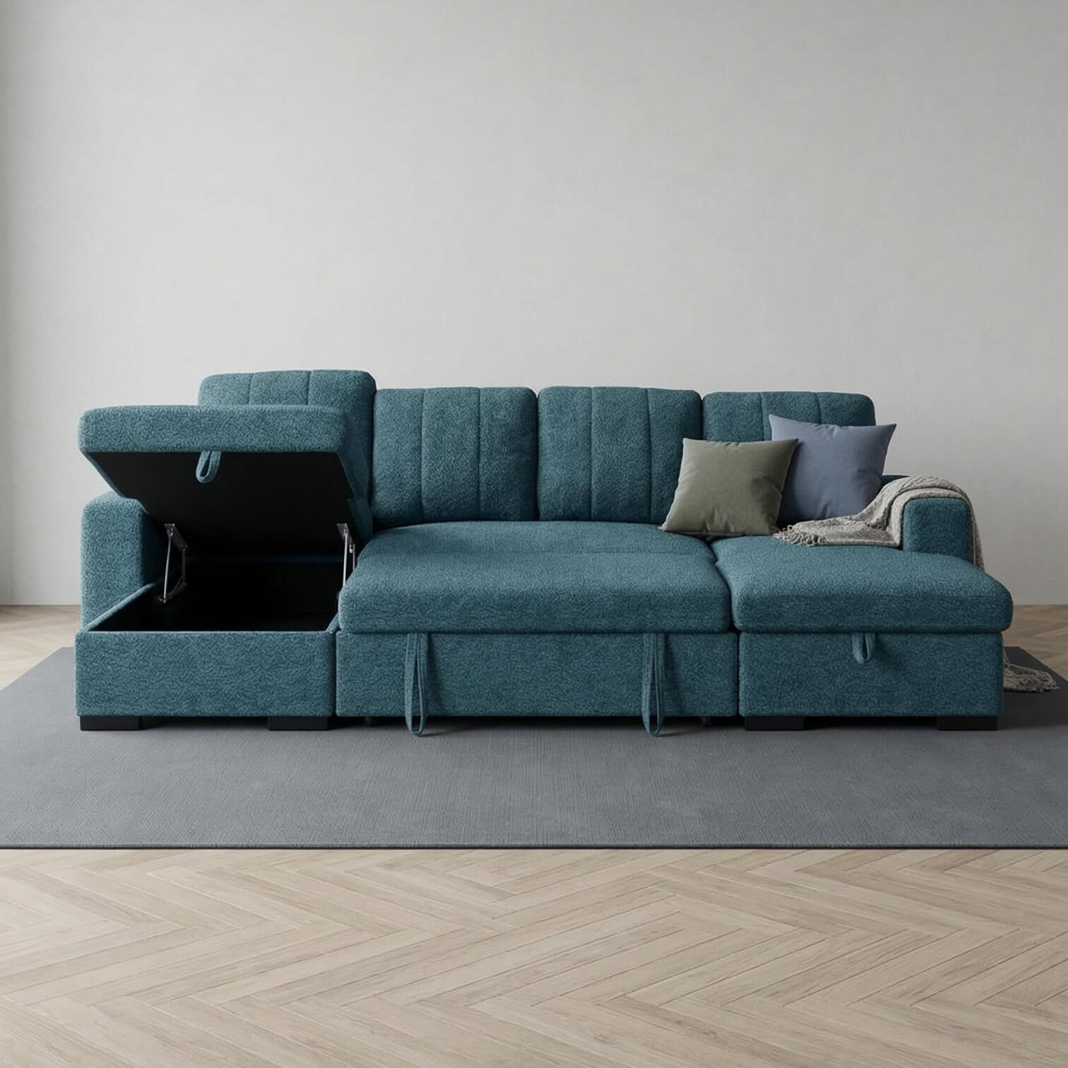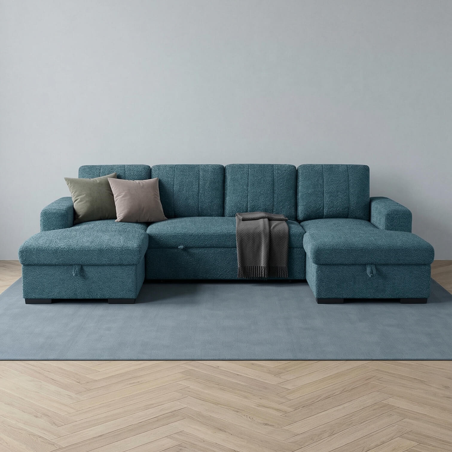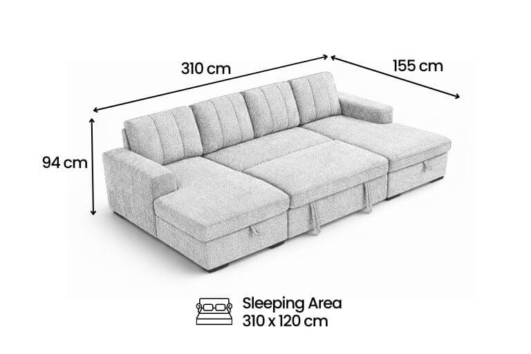 Confident colour, serious comfort. The Rene U Shape Sofa in Tide Blue brings depth and personality to modern homes while delivering practical performance. Designed with seating for six, dual lift up storage chaises and a spacious pull out sofa bed, it adapts easily to family life and overnight guests. Upholstered in durable polyester and supported by a solid hardwood frame, this U shape sofa offers medium comfort with bold contemporary appeal.