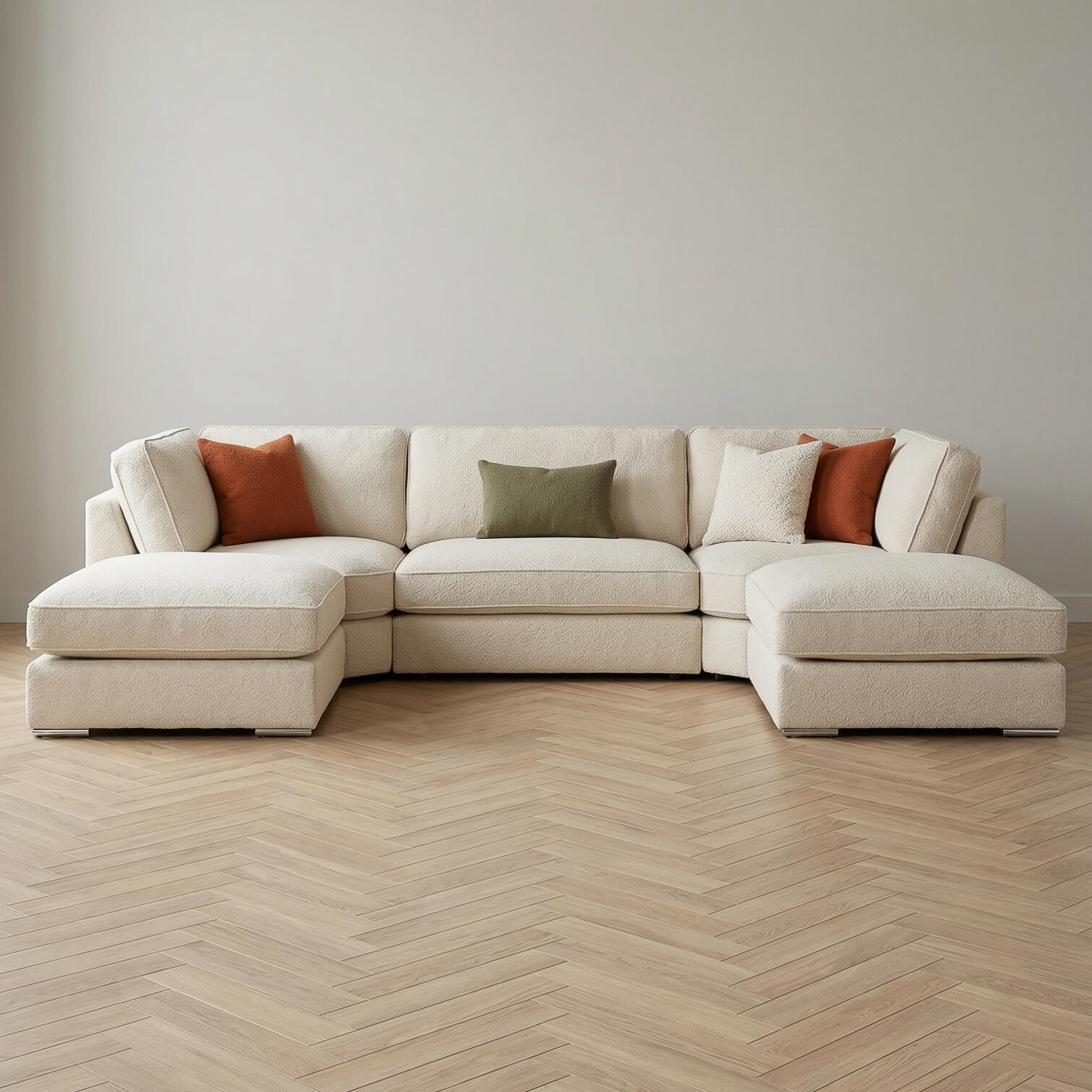 Create a calming centrepiece with the Sakina U Shape Sofa in Sandstone Beige. Crafted in soft boucle, it features removable cushions and flexible footstools for versatile seating. With chrome feet and full back support, this u shape sofa blends elegant design with everyday comfort, ideal for a bright and welcoming living space.