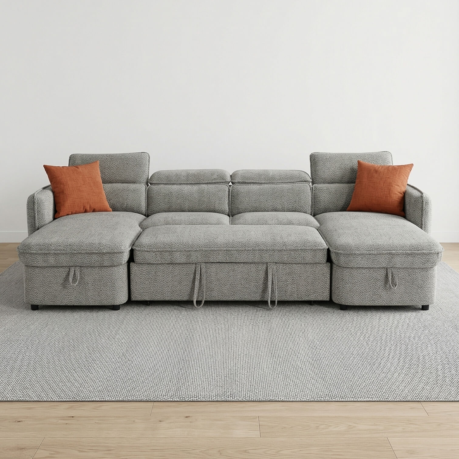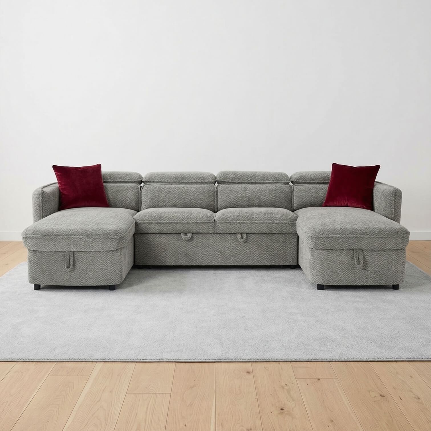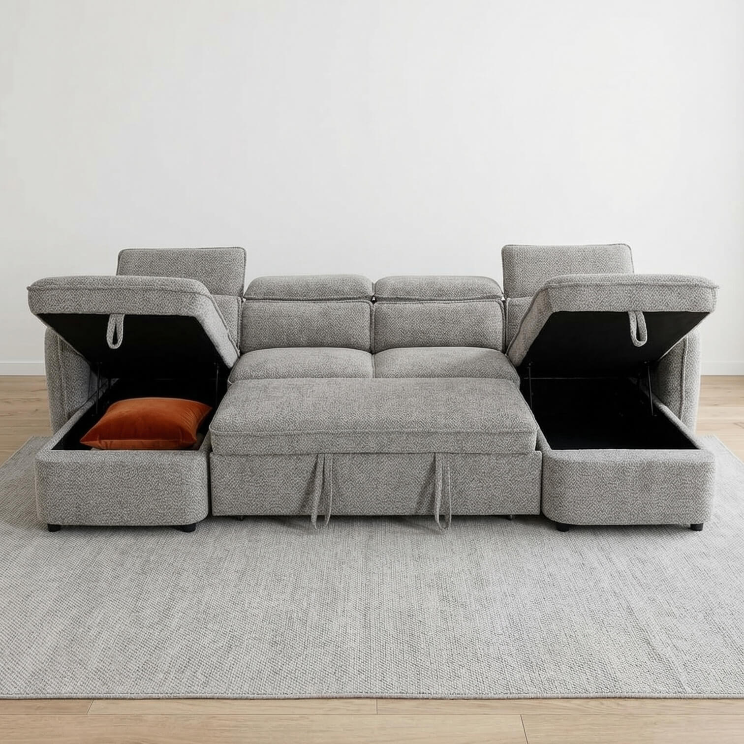 Modern living needs smart sofas. The Solara U Shape Sofa Bed in New Grey delivers spacious six seat comfort with built in flexibility. Featuring adjustable headrests, dual lift up storage chaises, and a smooth pull out sofa bed, it is designed for family homes that need more from their furniture. Upholstered in textured polyester and supported by a solid hardwood frame, this large U shape sofa balances durability, comfort, and everyday practicality with ease.