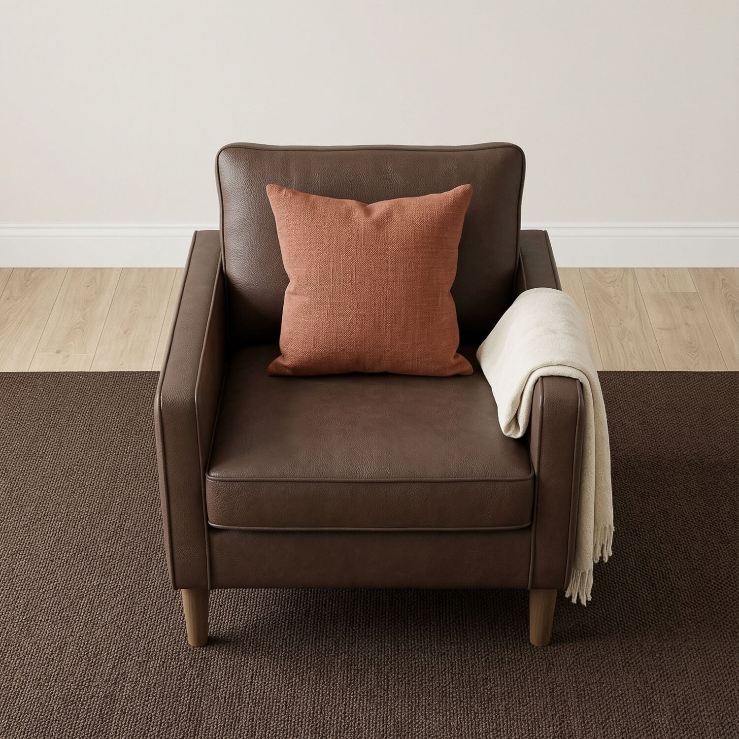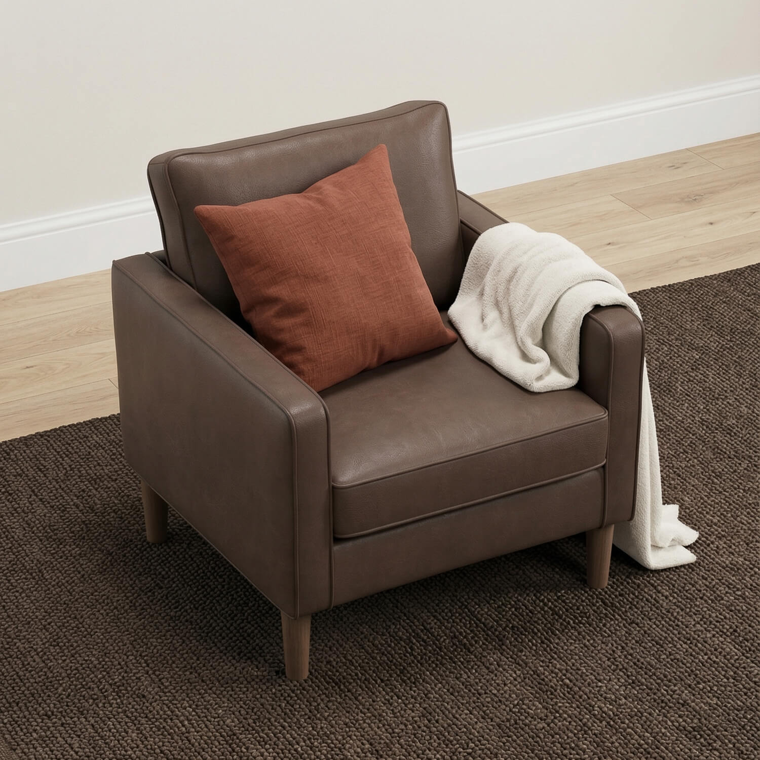 The Theo Armchair in Chestnut Brown brings warm, modern style with the durability you expect from Sofabase. Faux leather keeps things practical, while pocket sprung seating and fibre filled backing give you supportive comfort. Compact, stylish and built to last, a great value essential for living rooms, bedrooms or home offices.